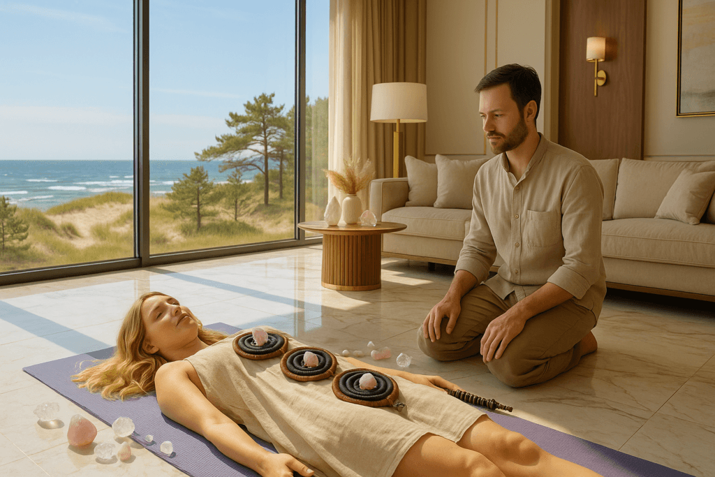 To nowoczesna forma pracy z energią, w której terapeuta przyjeżdża do Ciebie, tworząc w Twojej przestrzeni harmonijne pole energetyczne sprzyjające regeneracji, relaksowi i wewnętrznej równowadze. Zabieg odbywa się z użyciem Bioenergetycznego Systemu Balansującego – urządzenia opartego na zasadach energii życiowej i biopola człowieka, wykorzystującego miedziane cewki, kryształy oraz GANS-y.